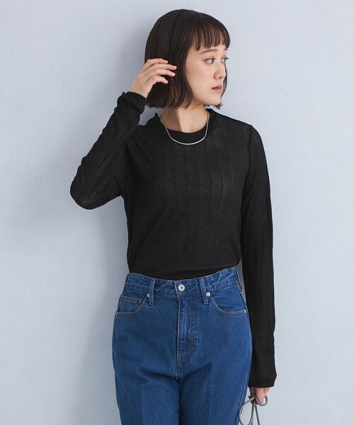 シアー×テレコ素材がポイントの新作プルオーバー ■デザイン ワイドなテレコ素材が目を惹くプルオーバーカットソー。 デコルテをきれいに見せてくれるネックラインにこだわってお作りしました。 ジャストフィットシルエットなので、さまざまなスタイリングに◎ 着回しに便利なブラックとナチュラルと、スタイリングのアクセントになるレッドカラーの3色です。 ■素材 ほどよい透け感と、凹凸感が特徴のワイドテレコカットソー。 コットン×ナイロン素材なので、コットン100%よりも編み地に張りがありシャープな印象です。 ■コーディネート 長めの袖丈なので、手元をクシュっとさせて女性らしい着こなしが〇 同素材のカーディガンと合わせたスタイリングもおすすめです。 ・同素材のカーディガンのご用意もございます。対象品番:36271370245 #夏服,#秋服 ============================ 透け感:あり ケア方法:手洗い可 ============================ 【注意事項】 ※商品を使用前に、タグ等に記載されている「取り扱い上の注意書き」、「洗濯表示」を必ずご確認ください。 ※商品画像は、光の当たり具合やパソコンなどの閲覧環境により、実際の色味と異なって見える場合がございます。あらかじめご了承ください。 ※商品の色味の目安は、商品単体の画像をご参照ください。 店舗へお問い合わせの際は、全国のgreen label relaxing各店舗まで下記の品名/品番をお申し付けください。 品名:FFC シアーワイドテレコ PO 品番:36121372406