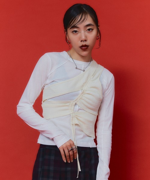 <Fabric> 長袖Tシャツはさりげなく透け感のある柔らかなコットン生地を使用。 タンクトップは表面に凹凸感があり柔らかく伸縮性のある生地を使用。 <Style> 長袖Tシャツは切り替えのデザインが入っているので一枚で着ても◎ タンクトップはお持ちの半袖Tシャツやワンピースなどとレイヤードにもおすすめ。 お得感のある今季の2ピースセットトップスです。 少し透け感のある素材を使った長袖と、デザイン性の高いタンクトップを重ねることで、オシャレな印象を与えてくれる女性らしい一着です。 コーディネートが簡単にでき、一気にトレンディな印象に。 フロントに垂れたリボンデザインも魅力の一つです。 一枚でも、重ね着でも、オールシーズンお使いいただけます。 【led.tokyo/レッドトーキョー】 TOKYOから生まれるファッション・アート・ 音楽・映画・漫画をはじめとした様々なカルチャーからのインスピレーションをコレクションに落とし込んでいます。 TOKYO的なファッション・カルチャーの ミックスアップ・編集感覚はそれぞれのアイテムに落とし込まれ、様々なスタイリングを生み出すことができます。 袖が取り外せたり、前・後ろで着られたり、 ひとつのアイテムから様々な着こなし、無限のスタイリングアイディアが生まれます。 ブランドが考えるルックブック的なスタイルではなく、着る人それぞれが自分だけのスタイルを生み出していく。 それが『led.tokyo』の考えです。 【お買い物をよりお楽しみいただくために】 ■商品のお気に入り登録(ハートマークをクリック) 完売カラーの再入荷通知や、在庫ラスト1点の通知、セールの通知を受け取ることができます。 ■ブランドのお気に入り登録 新商品がUPされたり売り切れ商品が再入荷したときなど、いち早くブランドのお得な情報を受け取ることができます。 是非ご利用頂き、お買い物をお楽しみください。