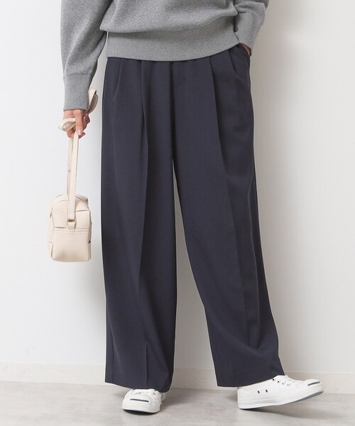 【デザインポイント】ウエストベルトのあるタック入りのワイドパンツです。ハンサムコーデにマストなシルエットです。※ポケット数:横×2 後ろ×2【スタイリングポイント】短丈のコンパクトトップスと合わせるトレンドスタイルにもおすすめです。【素材ポイント】織の表情があるクラシカルなムードある素材です。しわになりにくいのも特徴です。※裏地なし※照明の関係により、実際よりも色味が違って見える場合があります。また、パソコン・スマートフォンなどの環境により、若干製品と画像のカラーが異なる場合もございます。モデル情報:身長168cm B76 W58 H86 着用サイズ:02(M)店舗へのお問い合わせ商品番号:F58-69050●製品寸法:01(S):W66cm H86cm 股下68cm 前股上33cm 渡り幅30cm 裾幅27cm02(M):W69cm H88cm 股下69cm 前股上33cm 渡り幅31cm 裾幅28cm03(L):W72cm H90cm 股下71cm 前股上34cm 渡り幅32cm 裾幅29cm備考: