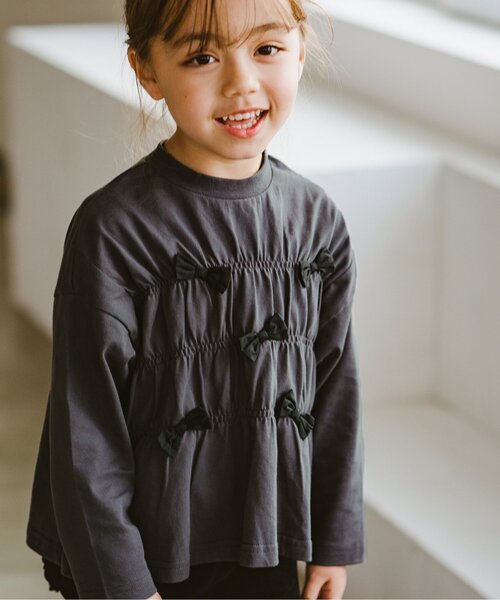 リボンがたくさんついた長袖Tシャツ。 シャーリングとふわっと広がる裾のデザインがアクセントに。 モノトーンカラーで甘くなりすぎず大人っぽい可愛さ。 チュールスカートと合わせたコーディネートがおすすめです。 【取り扱い表示】 40℃を上限に洗濯機で洗濯、デリケートアイテムモード、ネット使用、漂白剤を使用禁止、色物は同系の色と一緒に、洗濯後直ちに取出し、タンブル乾燥不可、日陰で吊り干し、低温でアイロン、商業ドライクリーニング不可 ※商品により多少の誤差が生じる事がございます。あらかじめご了承下さい。 ※ご使用のパソコンやブラウザの環境により、実際の色とは多少異なる場合がございます。 ※モデル着用写真についてはイメージの為、実際の商品とカラーや仕様が異なる場合がございますので、商品画像をご覧ください。 【 p.premier -ピードットプルミエ- 】 着心地のよい素材 細やかなシルエットまでこだわったデザイン コーディネートしやすいけれど存在感のある色使い シンプルで、それでいて今っぽい 男の子も女の子も気分で選べる 何気ない1日から、とっておきの日まで p.premierは ママの「こんなこども服がほしい」を とくべつな想いを込めて届けます