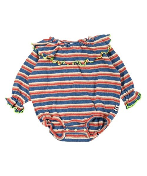 【HOGAN RANCH WEAR】 大きな衿が可愛すぎる♪ ベビーちゃんもオシャレしておでかけ。 ■デザイン 個性的なソウガラが目を引くかわいいロンパースです。 ボーダーの配色も印象的。 首元と袖口のリブ配色もポイント♪ ギャザーたっぷりのふんわり袖もたまりません。 被りタイプなので、お腹や背中が出る心配ナシ。 股部分にはカラースナップボタン付き。 おむつ替えやお着替えがラクラクです。 ■スタイリング おうちでのリラックスタイムに1枚で。 レッグウォーマーやスカートと合わせてお出かけもカワイイ! ■生地感 タオルのような柔らかいパイル生地。 肌触りがとってもよく、伸縮性にも優れています。 赤ちゃんの動きに優しくフィットする柔らかい生地感です。 ++++++++++++++++++++++++ 透け感:なし(オフホワイトのみ少しあり) 伸縮性:あり 生地の厚み:普通 裏地:なし ++++++++++++++++++++++++ ■リンクコーデアイテム キッズ ・パイルフリルカラーカットソー:0010342030 ・パイルメロー2wayサロペット:0010142001 ・パイルキャンディロングパンツ:0010142002 おとな ・パイルフリルカラーカットソー:0010342031 ■色柄について プリントデザインの並び位置などが、商品1点ずつ異なります。 お選びいただくことはできませんので、予めご了承くださいますようお願い致します。 ハートマークをポチッ! 気になる商品はお気に入り登録をお忘れなく! 商品のお気に入り登録をすると... [再入荷][残り1点][セール情報]を受け取れます。 MARKEY'Sをお気に入り登録すると... [新商品][再入荷]の情報をいち早く受け取れます。 ― HOGAN RANCH WEAR/ホーガンランチウェア ― キャッチ-な遊び心あふれるオリジナル柄が特徴のブランド。 「みんなが笑顔になれる」アイテムを提案します。