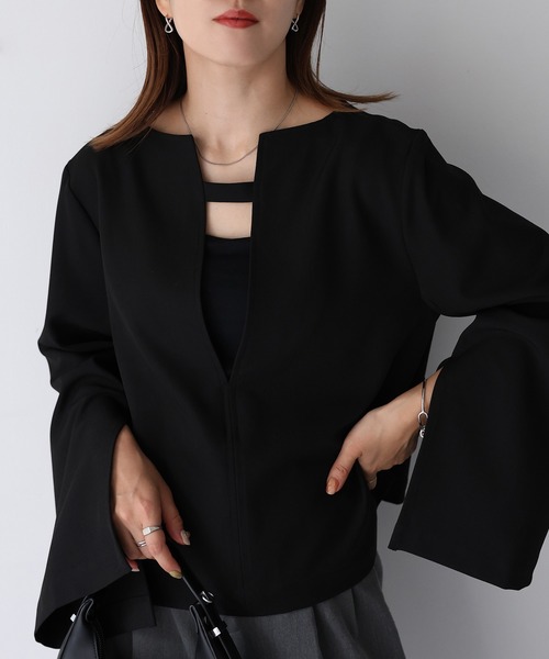 【Riberry 前後2WAYキーネックトップス】\女性らしいデコルテ見せ!/胸元のカットアウトデザインが目を引く2WAYトップス♪■Styling深めのVネックデザインが印象的で抜け感のある、大人ブラウスが登場しました。袖口にかけて広がるアームのデザインはニュアンス感があり、スリットが入っているためより垢抜けた印象に。Vネックで着ることはもちろん、リボンのデザインを前面にして着用することも可能なので雰囲気変えて楽しんでいただけます。さらっとした素材で上品な印象になるので、キレイ目なスラックスやテーパードパンツ。カジュアルミックスでデニムで合わせてあげるのもおすすめ◎ゆとりあるデザインなのでシアートップスやタートルネックを合わせるレイヤードスタイルもサマになります!デコルテのデザインが華やかな着回し抜群トップスです。■Detailゆったりとしたシルエットなので体型カバーができます。デコルテは深めのVネックなので顔回りがすっきり見える効果も◎前後で着れるので合わせやすいです。■Materialサラッとしたハリのある素材で着心地抜群。ポリエステルなのでしわになりにくいです。▽生地感透け感:あり 〇〇●〇〇 なし生地の厚さ:厚い 〇〇●〇〇 薄い裏地:あり伸縮性:なし※この素材は摩擦(特に湿った状態での摩擦)や雨、汗でぬれた際には他の衣料等に色が移ることがございますのでご注意ください。※お肌のデリケートな方は刺激を感じる場合がございます。※商品の梱包には細心の注意を払っていますが、通販の特性上、到着時に畳みシワがついている可能性がございます。予めご了承ください。※詳しいお手入れ方法は商品タグをご参照ください。【Information】◆《お気に入り登録》がオススメ◆・「商品のお気に入り登録」で再入荷通知や、ラストの通知、セール通知も受け取ることが出来ます。・「ブランドのお気に入り登録」で新商品や再入荷など、お得な情報を受け取ることが出来ます※撮影時のライティング、ご覧になっているモニター・PC環境により、実際の商品と色味が異なって見える場合がございます。予めご了承をお願い致します。※ご注文いただいた予約商品のお届け時期の確認は、注文履歴ページより行えます。