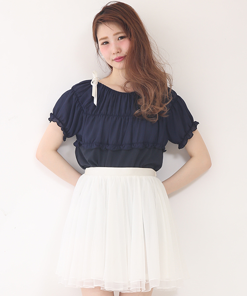 【one after another NICE CLAUP】(ワンアフターアナザーナイスクラップ) シャーリングのデザインがより女の子っぽくそして甘い印象に。カット素材で着やすく透け感が可愛い。 フレアスカートにインスタイルで合わせて着てあげるのがおススメです。 ショップへお問い合わせの際は下記品番をお伝え下さい。品番:116610650
