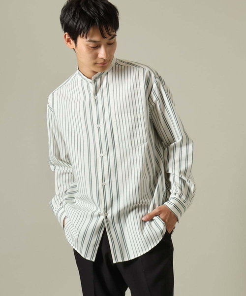 ◆セミワイドシルエットのバンドカラ―シャツ。 レイヤード・一枚着・ハオリとして様々な着こなしに重宝するアイテム。◆ 【デザイン】 シルエットはややゆとりのあるセミワイドシルエットで、気負わずリラックスして着用できるバンドカラーデザインの一着。 さわやかな配色感でさりげないアクセントになるストライプ柄がポイントです。 【素材】 オリジナルのランダムストライプ柄を用いたツイル素材を使用。 コットン100%でやわらかさもあり肌馴染みもよいです。 ご自宅で洗濯機洗いができるためデイリーユースに着用できるのも嬉しいポイントです。 【スタイリング】 アウターのインナー使いや一枚着・ハオリとしてのアウター使いなど、様々なシーンで着用できる今季の気分にぴったりなアイテム。 冬にはニットのインナーに着ることで、首元や裾のさり気ないレイヤードスタイルが演出できる汎用性の高いシャツです。 ---------------- 透け感:なし 裏地:なし 伸縮性:なし 光沢感:なし 生地の厚さ:普通 ---------------- ≪お気に入り登録機能の使い方≫ ■商品のお気に入り登録(ハートマークをクリック) 再入荷通知や値下げ等、お得なご案内を受けることができます。 ---------------- ※商品画像は、光の当たり具合やパソコンなどの閲覧環境により実際の色味と異なって見える場合がございます。 商品の色味の目安は商品単体の画像をご参照ください。
