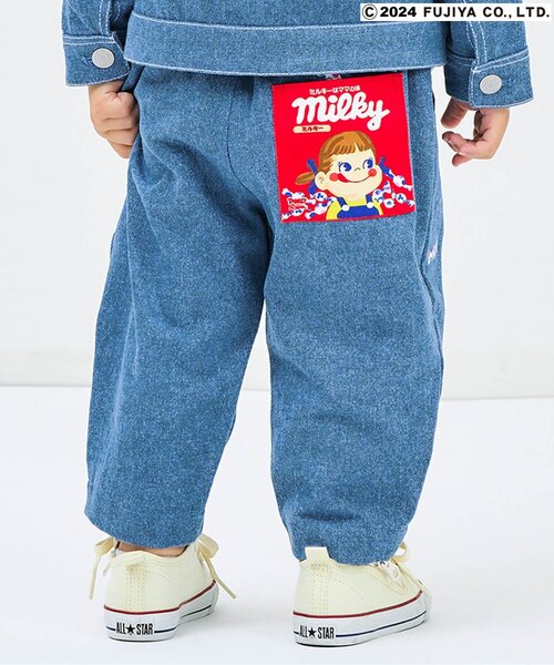 ミルキーの総柄刺繍や後ろポケットがミルキーのお菓子のパッケージデザインになっているとってもかわいいデニムパンツ♪ 柔らかい素材で小さなお子さまでも着やすい仕様に。 ストレッチは効いていないですが、その分、ゆったりめのシルエットになっているので、着脱はしやすいデザインになっています。 ウエスト部分はゴムになっていて、ゴムの入れ替えも可能なのでお子さまに合わせて調整していただけます。 ポケットもついているので、小物や小さなおやつも入れられて便利! 前部分の飾りボタンもポイント♪ ※デニム素材の為、色味に個体差がございます。 【取り扱い表示】 40℃を上限に洗濯機で洗濯、漂白剤を使用禁止、色物は同系の色と一緒、洗濯後直ちに取出し、タンブル乾燥不可、日陰で吊り干し、低温でアイロン、商業ドライクリーニング不可 ※商品により多少の誤差が生じる事がございます。あらかじめご了承下さい。 ※ご使用のパソコンやブラウザの環境により、実際の色とは多少異なる場合がございます。 ※モデル着用写真についてはイメージの為、実際の商品とカラーや仕様が異なる場合がございますので、商品画像をご覧ください。 【 apres les cours -アプレレクール- 】 「キオク いろどる、こどもふく。」 大切なキオクを彩る、お気に入りの一枚。 「アプレ レ クール」は独自の色づかいやテキスタイルで日々をトクベツに過ごせる そんな「一枚」をお届けします。