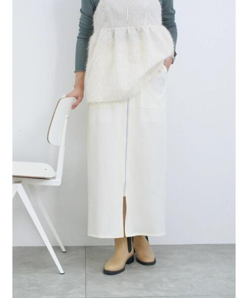 フロントに施されたジップラインがスタイリングのアクセントになるスカート。すとんとしたタイトシルエットになっているので、美しい脚のラインを演出します。バックのウエストゴム仕様がラクな着心地を実現◎シンプルなTシャツやカットソーと合わせてもおしゃれに決まるアイテムです。※商品画像は、撮影環境やお客様のご利用のPC・スマートフォンのモニター環境などにより実物と色味に差異がある場合がございます。【その他採寸】F ウエスト:[後ゴム仕様]66cm