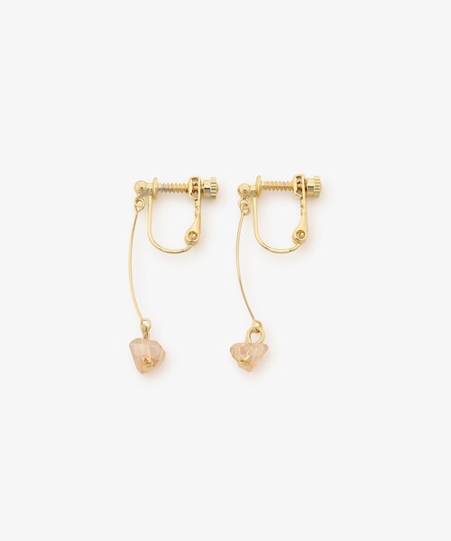 ガラスを使った多角カットのモチーフがポイントのイヤリング。細身のパーツときらりと光るモチーフが作り出す品の良いムードが、耳元を洗練された印象へと導いてくれます。留め具には、装着と調節がしやすいネジバネ式を採用。痛みも少ないので、長時間のお出かけにもぴったりですよ。ほどよくシンプルながらも華やかさがあり、きれいめカジュアルからオフィススタイル、セレモニーまで幅広く活躍します。高温、多湿の場所や極寒地での使用は、火傷、凍傷の原因となる場合がありますのでおやめください。アクセサリーを着用のまま、激しい運動や力仕事をする時、お子様や幼児の世話をする場合、身体に思わぬ危害を及ぼす可能性があります。また、ゆがみ、変形の原因になりますのでご使用をお避けください。体質により、皮膚に異常を感じたり、かぶれなどの症状が起きたりすることがあります。その際はすぐにご使用をおやめいただき、皮膚専門医にご相談ください。ご使用中に衣服と擦れて表面の金属が摩耗し、衣服を部分的に黒くすることがあります。また、色物は薬品類、雨、汗、湿気などの原因により、色が落ちる場合がありますので、十分にお気をつけください。衝撃や摩擦によって、傷、色落ち、石や付属取れをおこすことがありますので、十分にお気を付けください。温泉で変色する場合がありますので、外して入浴してください。お子様が口に入れたり、飲み込んだりしないようご注意ください。小さな部品は特にご注意ください。お子様の手の届かないところに保管してください。使用後は柔らかい布でよく拭き取り、保管してください。汗等で濡れたまま放置しておきますと、変色、サビ、メッキ剥離、腐食等の原因になります。