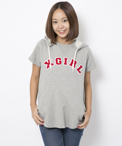 後付けフードがおしゃれなフードチュニック。フロントにはフェルトのロゴワッペンをオン!春先にぴったりな半袖スウェットなので、アクティブに着こなしてお出かけをして!!