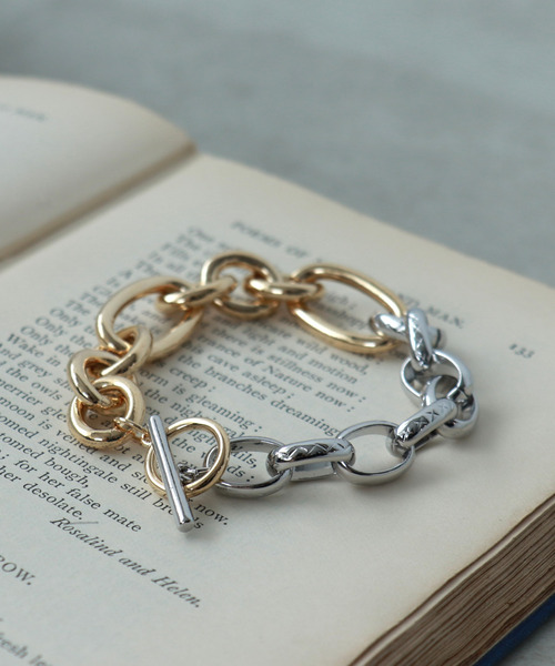 ■ボリュームチェーンが特徴的なコンビメッキブレス■ 異なるチェーンを組み合わせたメタルブレスレット ゴールド×シルバーのコンビでスタイリングが華やかに◎ 太すぎないチェーンなので重ね付けにも使い易く、1つでも存在感のあるデザインです。季節問わずオールシーズンお使い頂け、デイリーにはもちろん ドレスアップスタイルにもオススメです。 ▼商品画像について▼ ※撮影場所やお使いのモニター環境により実際の商品と若干お色味が異なる場合があります。 ======================= 《お気に入り登録》でお得な情報がたくさん! ▼商品のお気に入り登録▼ ♡をクリックしてお気に入り登録をすると 再入荷通知やラスト1点の通知をお知らせします。 ▼ブランドのお気に入り登録▼ お気に入りショップに追加していただくと いち早く ThreeFourTime のお得な情報・新入荷情報を 受け取ることができます。 =======================