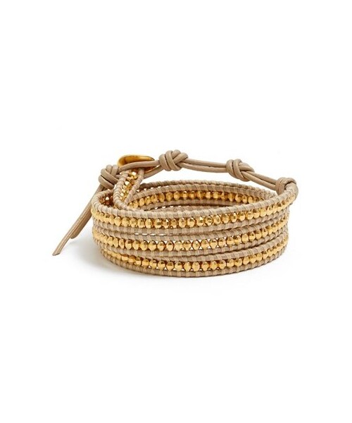 A sparkling charm symbolizes protection on a gleaming leather wrap bracelet beaded with faceted vermeil nuggets. 32" length; 2 1/2" extender; 1/4" width. Sterling silver with 18k-gold plating/leather. By Chan Luu; imported.