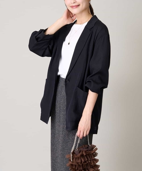 ◆季節の変わり目に使えるシアージャケット◆ 【デザイン】 ・トレンドのシアージャケット ・季節の変わり目に使いやすいセミシアー素材で秋に活躍する一枚です ・程よいオーバーサイズでカジュアルにも合わせやすいシルエット ・定番のデニムとも相性抜群 ・上品な光沢素材で大人も着やすいジャケットに仕上げました ・ベーシックなブラックとトレンド感のあるブラウンの2色展開 【素材】 ・程よい透け感のセミシアー素材 ・上品な光沢感のある素材 【コーディネート】 Tシャツ合わせはもちろん、タンクトップやキャミ合わせで 抜け感のあるスタイリングがおすすめ。 合わせるアイテム次第でカジュアルにもきれいめにもご着用いただけます。 -------------------- 透け感:ややあり 裏地:なし 伸縮性:なし 光沢感:ややあり 生地の厚さ:薄手 -------------------- ≪お気に入り登録機能の使い方≫ ■商品のお気に入り登録(ハートマークをクリック) 再入荷通知や値下げ等、お得なご案内を受けることができます。 -------------------- ※商品画像は、光の当たり具合やパソコンなどの閲覧環境により 実際の色味と異なって見える場合がございます。 商品の色味の目安は商品単体の画像をご参照ください。 ※34(XSサイズ)・42(XLサイズ)はWEB・一部限定店舗での販売です。
