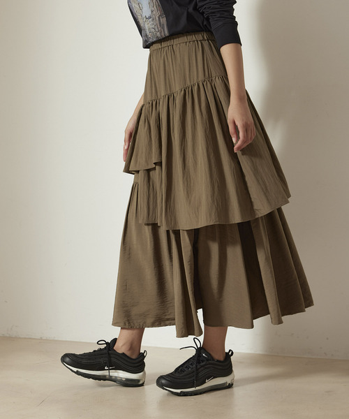 【デザイン・シルエット】 左右異なるティアード切替が特徴的で、用尺もたっぷりとあり、動くたびにユラユラと揺れるのが軽やかなアイテム。 ふんわりと柔らかさを感じるデザインとボリューム感が華やかさを与えてくれます。薄手のロング丈でデイリーからお出掛けスタイルに。 【スタイリング】 デザインのあるスカートのため、カジュアルになりがちなTシャツアイテムと合わせても程よくカジュアルダウンしたスタイルに仕上がります。 ブラウスなどとのキレイめなスタイルもおすすめです。 【素材】 レーヨン70% ナイロン30% 薄手でサラッとしており、今の暑い時期に着心地のよい素材を使用。 ーーーーーーーーーーーーーーーーーーーーーーー 透け感:なし 裏地:なし 光沢感:なし 伸縮性:なし 生地の厚さ:薄手 ーーーーーーーーーーーーーーーーーーーーーーー 【モデル着用サイズ】 モデル H164 B81 W61 H90 着用サイズ FREE ロングスカート/ティアード/アシメントリー/フレアスカート ※実際の商品はお客様のお使いの端末や閲覧環境により、写真と実物の色味や質感が多少異なって見える場合がございます。予めご了承ください。