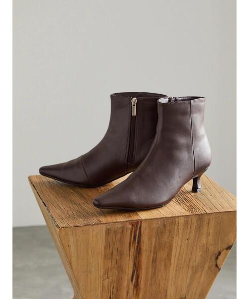 美しいシルエットを追求したショートブーツ。 シャープなシルエットで、スマートにスタイリングすることができるのも魅力的なポイント。ミドルヒールなのできちんと感がありながらも疲れにくい1足です。パンツやスカートなど、どんなボトムスともバランスよくマッチしてくれる1足です。 ※商品画像は、撮影環境やお客様のご利用のPC・スマートフォンのモニター環境などにより実物と色味に差異がある場合がございます。 【その他採寸】 37 全長:[ブーツ丈]13cm 幅:[履き口周り]27cm 38 全長:[ブーツ丈]13.5cm 幅:[履き口周り]28cm
