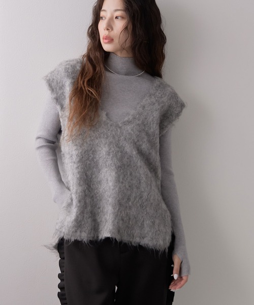 シンプルシャツにONするだけ 今季マストなミックスカラーベスト 【ディティール】 複数色の糸をMIXさせ編みたてた表情豊かなシャギーニットベスト。 毛足の長い糸をMIXさせ表面に起毛加工を施すことで美しい杢カラーを表現しました。 深く開いたVネックで顔回りをすっきりと見せてくれます。 今季押さえておきたいグリーンベース、オレンジベースのミックスカラーが新鮮。 極上のふんわり感に加え、ウールブレンドならではの暖かさも兼ね備えた1枚。 オーバーすぎないサイジングがカジュアルにもきれいめにもマッチします。 ストレッチ性があり、柔らかな肌ざわり。また肉感があるのにとても軽い着心地でデイリーに手に取りやすいアイテムです。 【素材】 ウール混でもチクチク感は全くなく、着て頂くと感じられるソフトで軽さのある仕上がりになっております。 保温性に優れ、秋冬にぴったりです。 【スタイリング】 ハイゲージニット、シャツ、カットソー、何にでも合う万能ニットベスト。 シンプルなコーデにプラスするだけで、ぐっと今年らしくアップデートしてくれます。 ********************** 透け感:なし 裏地:なし 伸縮性:あり 光沢感:なし 生地の厚さ:肉厚 ********************** こちらのアイテムは公式Instagram内にて詳細を掲載しております。 ぜひご覧くださいませ。 rectangle公式Instagram / @rectangle_official ※ご覧のモニター環境や撮影環境により実際の商品と多少色味が異なって見える場合がございます。 ご理解の程よろしくお願いいたします。