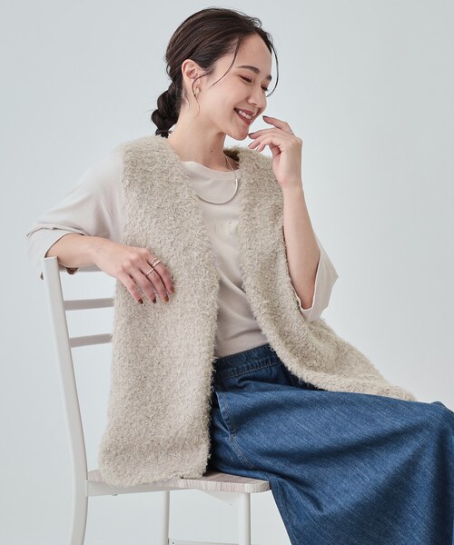 パッと目を惹くコーデの主役、フェイクファージレ 【デザイン】 シーズンライクな装いが叶う、フェイクファージレ。 スカートにもパンツにも合わせやすいように、 昨年より少し丈を短くしてより合わせやすい丈にしています。 トップスにボリュームをもたせることで華奢見せも叶います。 【スタイリング】 気になるお腹や腰、お尻回りのシルエットをさりげなくカバーしてくれるので、 大人世代にこそおすすめしたい旬アイテム。 トップスはインせず、落ち感のあるスカートやワイドパンツを合わせたゆるズルコーデで 体型カバーと大人の抜け感を演出します。 細身のパンツやナロースカートと合わせたメリハリあるスタイリングも ジレをプラスするだけで旬コーデに。 【素材】 毛足が長くくるくるとカールしているのが特徴的な暖かみのあるプードルフェイクファー。 立体的で厚みがあり、ふわふわした肌触りです。 ※照明の関係により、実際よりも色味が違って見える場合があります。また、パソコン・スマートフォンなどの環境により、若干製品と画像のカラーが異なる場合もございます。 モデル情報:身長163cm B81 W59 H88 着用サイズ:02(M) 店舗へのお問い合わせ商品番号:741-29002 ●製品寸法: 02(M):着丈66cm B100cm 肩幅36cm 03(L):着丈68cm B104cm 肩幅37cm 04(LL):着丈70cm B108cm 肩幅38cm 備考: