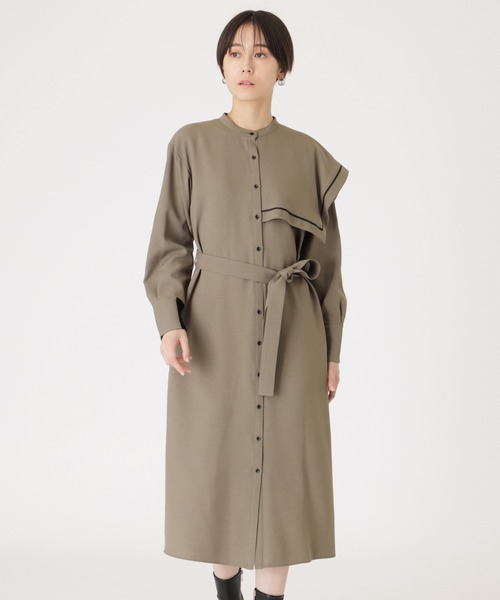 【CAST:キャストコロン 2024年秋冬アイテム】【Design】アシンメトリーな襟元のデザインが目を引くCAST:らしいワンピース。肩にかかったケープ風のデザインがトレンチコートのようなディテールで、ボタンを開けてアウター感覚でも着用可能なワンピースです。【Fabric】特殊な糸を使用した、ハリがありながらもしなやかな質感が特徴のポリエステル素材です。適度な軽さとシワになりにくい生地感で、イージーケア性も兼ね備え実用的です。【Styling】1枚でスタイリングが完成するデザインアイテム。大胆なケープ風ディテールはこなれた印象を引き立てつつも、ウエストシェイプでスタイルアップ効果も期待できるモードワンピースです。●洗濯:手洗い可透け感:なし伸縮性:なし生地の厚さ:普通おすすめ着用期間:春、秋、冬※この商品はサンプルでの撮影を行っています。実際の商品とイメージ、サイズ、品質表示、原産国等が異なる場合がございます。※店頭及び屋外での撮影画像は、光の当たり具合で色味が違って見える場合があります。商品の色味は、スタジオ撮影の画像をご参照ください。