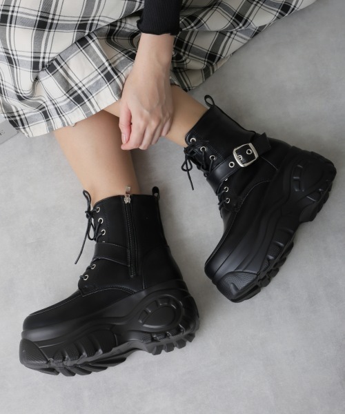 【軽量 厚底ソール レースアップ スニーカーブーツ】 ■詳細 やっぱり今年も厚底♪ 履くだけですぐにトレンドの足元ボリュームスタイルになれるアイテム☆ ボリュームのあるソールが存在感も抜群! 定番のレースアップデザインにバックルベルトがアクセント。 スニーカーソールのMIXデザインで、今どき感のある見た目がおしゃれ&可愛い♪ どんな着こなしにも合わせやすく、1足は持っておきたいスニーカーブーツです。 傾斜は少なくフラットに近い厚底ソールなので歩きやすい。 レースアップで足元をしっかり固定、ベルト部分も調整可能で安定感抜群◎ インソールはクッション性があり、足への負担も軽減してくれます。 厚底なのに見た目より軽量で長時間履いても疲れにくいのも嬉しいポイント☆ デイリー履きにどんどん使えて、スタイルアップも期待出来る1足です 内側サイドファスナー仕様なので、脱ぎ履きも楽チン♪ ラフにスポーティーな感じや、ミニ丈のボトムにブーツをしっかり見せるスタイル、ロングスカートからチラッと覗かせるスタイル、様々なコーデに合わせれる所もポイントです♪ ライブやフェス等にもオススメ◎ シーズンレスになりつつあるショートブーツは秋冬だけでなく、オールシーズン活躍間違いなし☆ オシャレのはずしにも使える万能アイテムです。 ■商品のご案内 素材:合成皮革 原産国:中国 ■サイズ S:約22.0㎝~22.5㎝ M:約23.0㎝~23.5㎝ L:約24.0㎝~24.5㎝ LL:約24.5㎝~25.0㎝ ヒール/ソール:約8.5cm プラットフォーム/ストーム:約6.0cm 底幅(Mサイズ):約10.0cm 甲周(Mサイズ):約14.0cm 筒丈(Mサイズ):約14.0cm 重量(片足Mサイズ):約415.0g ※履き方・足型等、個人差がございますので、あくまでも参考程度にお考え下さいませ。 【商品のお気に入り登録】 気になった商品の再入荷やセールの通知を受け取ることが出来ます! 【ブランドのお気に入り登録】 新商品の入荷やお得な情報など受け取ることが出来ます! ☆この機会に是非ご登録下さい☆