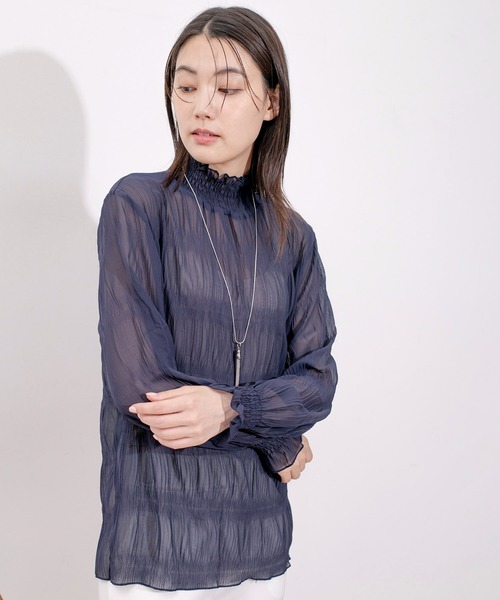 【デザイン・シルエット】シアー素材でインナーに重宝するプルオーバー。ふんわり立体感のあるシャーリングブラウスです。伸縮性のある素材感でストレスフリーな着心地も魅力。豊富なカラーバリエーションで色違いでの購入もおすすめです。【素材感】シフォン素材の程よいシアー感のある素材【カラー】01 クロ 11 シロ 12 オフシロ 20 コゲ茶 30 グリーン 33 ライトグリーン 40 コン 44 ブルー 50 パープル 52 ラベンダー 63 ピンク 64 ローズピンク 66 ワイン【スタイリングポイント】カジュアルからフェミニンまで、幅広いスタイリングに合わせやすい1枚。レイヤード使いでもコーデを楽しめるのでロングシーズン活躍できます。様々なボトムスと相性抜群です。裏地:なし光沢感:なし透け感:ありポケット:なし伸縮性:あり生地の厚さ:普通ボタン:なしその他仕様:なし季節:オールシーズン※撮影時の光、お使いのモニター環境によって色の見え方が違う場合がございます。予めご了承ください。モデル身長:166cm 着用サイズ:M