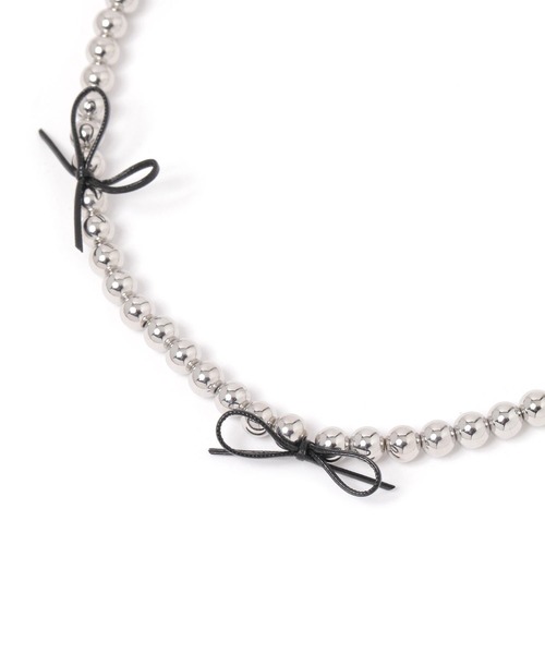 ボールチェーンにリボンモチーフをあしらったネックレス。リボンはフェイクレザーを使用し、甘くなりすぎずクールな印象のアイテムです。