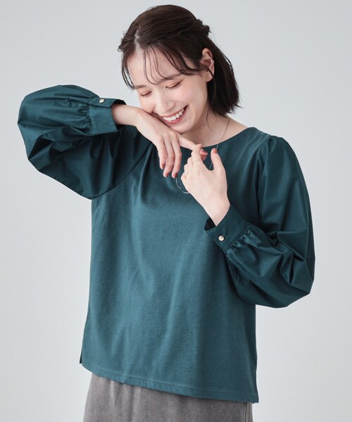 【デザイン】異素材を使用したボリュームスリーブが可愛いトップス。首元はクルーネックでシンプルに仕上げ、ボリュームスリーブを引き立ててくれます。身頃はカットソー素材、お袖にブラウス素材を使用しています。甘くなりすぎず、シンプルすぎない合わせやすい一枚です。【スタイリング】パンツ、スカートどちらでも合わせやすい一枚です。着丈は長すぎないので、インでもアウトでもどちらの着こなしでも決まります。ジャンスカやキャミワンピースなどのインナーとしてもおすすめです。【お客様からいただいたコメント】・仕事用に購入。秋らしい色ときれいめなデザインで気に入りました。 (身長:159cm 体型:普通 ライトグレーのMサイズ購入)・きちんと見えて、着やすい服です。 (身長:162cm 体型:ふっくら ライトグレーのLLサイズ購入) とのお声を頂戴しております。【素材】身頃は柔らかく肌ざわいの良いTシャツ素材、お袖に少しハリ感のあるブラウス素材を使用しています。リサイクルポリエステルを使用した環境にやさしい商品です。※本体素材のポリエステルの一部にリサイクル糸を使用しています。※照明の関係により、実際よりも色味が違って見える場合があります。また、パソコン・スマートフォンなどの環境により、若干製品と画像のカラーが異なる場合もございます。モデル情報:身長166cm B80 W59 H85 着用サイズ:02(M)店舗へのお問い合わせ商品番号:741-19334●製品寸法:02(M):着丈58cm B96cm 袖丈56cm 肩幅32cm03(L):着丈59cm B99cm 袖丈57cm 肩幅33cm04(LL):着丈60cm B102cm 袖丈58cm 肩幅34cm備考: