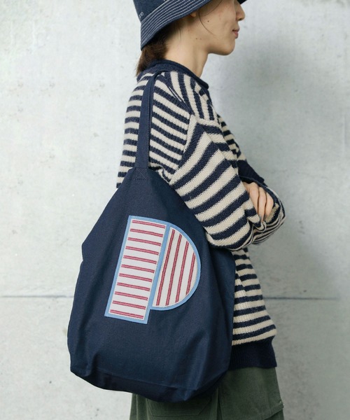 カレッジ風のワッペンが目を引くトートバッグ。 コーディネートのポイントとなるよう、ブランドネームの頭文字“P”を大きく縫い込みました。 オリジナルで編み立てたボーダー柄は、元気なイエローと、可愛らしすぎない絶妙なアイボリー×ピンク。イエローにはブラウン、アイボリーにはサックスのワッペンの土台が映えます。 ベースカラーは普段使いしやすいアイボリーとネイビーの展開。しっかりとした生地感でA4サイズがすっぽり入ります。マチ付きで収納力があるので通勤やエコバッグとしてもおすすめ。 -------------------- 透け感:なし 裏地:なし 伸縮性:なし 光沢感:なし ポケット:なし -------------------- 【素材の特性・お取り扱いの注意】 ・取り扱いの注意については取り扱い表示をよくご確認の上、着用をお願い致します。 ・手洗いする場合は中性洗剤で軽く押し洗いして下さい。もみ洗いしますと風合いが損われる場合がありますのでご注意下さい。 ・型崩れする場合がありますので、形を整えて日陰で平干しして下さい。多少縮む場合がございますのでご了承下さい。色ものは多少色落ちする場合がございます。タンブラー乾燥は絶対にお避け下さい。 ※撮影画像は、光の当たり具合やモニターの環境により色味が違って見える場合があります。あらかじめご了承ください。 ※着用画像はサンプルです。お届けする実際の商品と仕様、加工、サイズが若干異なる場合がございます。 アイボリーのサンプルの着用画像から持ち手の長さが5cm短くなります。