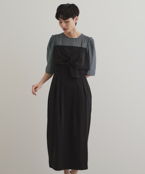 ドッキングデザインが華やか! オケージョンシーンにもおすすめのワンピース 【デザイン】 ・レイヤード風のドッキングデザインがポイントのワンピース ・前を結んだような立体感のあるデザインが華やかな一枚 ・ウエストをやや高めの位置で切替えており、スタイルアップがかないます。 ・ウエストの後ろにゴムを配しておりフィット感、着心地も◎です。 ・フィット&フレアデザインですが、広がらないシルエットで大人に着こなして頂けます。 ・後ろファスナーで着脱するデザインです。 ※ポケットなし ※裏地つき 【素材】 ・トップス部分には程よくシアー感のある合繊素材、ワンピース部分にはハリのあるポリエステル素材を使用 ・マシンウォッシャブルでお手入れも簡単です。 --------------- 【OPAQUE.CLIP NAVY/オペーク ドット クリップ ネイビー】 「ハレの日の特別な装い」をコンセプトに、想い出に残る大切なワンシーンを彩るアイテムを提案するレーベル。 通勤からセレモニー、パーティー等のシーンに対応した、良質感と華やかさのあるスタイルを提案します。 ※照明の関係により、実際よりも色味が違って見える場合があります。また、パソコン・スマートフォンなどの環境により、若干製品と画像のカラーが異なる場合もございます。 モデル情報:身長165cm B72 W57 H84 着用サイズ:38(M) 店舗へのお問い合わせ商品番号:637-59322 ●製品寸法: 38(M):総丈120cm B95cm 袖丈36cm 肩幅35cm W75cm H129cm 40(L):総丈123cm B98cm 袖丈37cm 肩幅36cm W78cm H132cm 42(LL):総丈123cm B101cm 袖丈37cm 肩幅37cm W81cm H135cm 備考: