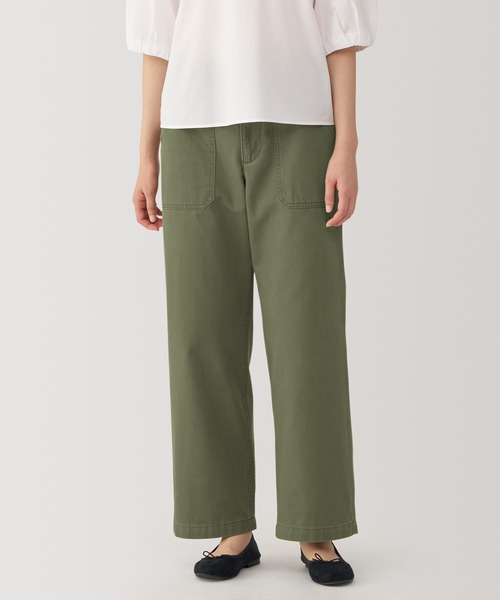 綿100%のやわらかな素材で、織り柄による表情が特徴です。綿はアフリカの自然が育てました。【素材】織り柄が特長のヘリンボーン生地を使用しました。綿を使用したやわらかな素材と、ゆったりとした風合いで快適なはき心地です。【デザイン】前後の大きなパッチポケットが特長的なワークパンツです。ヘリンボーン柄で仕立てました。色はベーシックなアイボリーとカーキグリーン、スタイリングのポイントにもなり、コーディネートもしやすい鮮やかなブルーの展開です。【仕様】透け感:なし伸縮性:なしフィット感:ゆったりめお取扱い上のご注意 : ●濃色製品は使用中の摩擦や濡れた状態での接触により色移りする事があります。洗濯の際は他のものと分けて洗ってください。お洗濯上のご注意 : ●淡色製品には蛍光増白剤入り洗剤を使用しないでください。お洗濯上のご注意2 : ●洗濯ネットをご使用ください。お洗濯上のご注意3 : ●アイロンはあて布を使用してください。お洗濯上のご注意4 : ●プリント部分はアイロンでこすらないでください。お洗濯上のご注意5 : ●付属部分にアイロンを当てないでください。