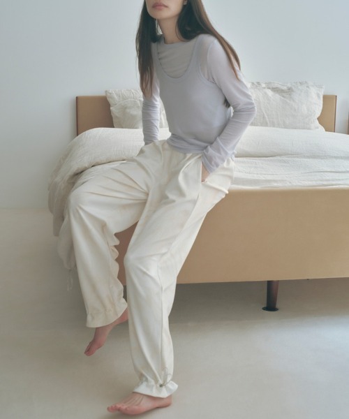【デザイン・シルエット】 柔らかく編み立てた、もっちり感のある生地にお肌に優しい保湿加工を施したオリジナルファブリックを使用。 テンションがある素材を使用し、ウエスト部分は後ろゴムになっており着用感も快適です。裾を引きづらないように後ろ部分のカッティングを高めに取った工夫されたカッティングがポイント。 さまざまなコーデに馴染みやすい無地カラーとニュアンス的なマーブリングが魅力の総柄プリントの2色展開です。 同素材でプルオーバー(品番:NJM14270)、スカート(品番:NJC14240)も展開中。 【コーディネート】 シャツ合わせできれいめに着こなすのもおすすめ。クロップド丈のトップスとも相性抜群。 【素材】 skin wear:保湿加工を施したお肌に優しい素材 ariy jersey:ポリエステル糸を接結構造にして生地と生地の間に空間を作り、膨らみと軽さを実現。 UV、接触冷感、保湿加工、サスティナブル素材。 もっちり感が心地いいダンボール素材を使用しました。 ほどよいはり感でキレイ見えしながらも、しっかりとしたストレッチ感が魅力の生地です。 ペットボトル由来の再生ポリエステルを使用したオリジナルファブリックです。 ーーーーーーーーーーーーーーーーーーーーーーー 透け感:なし 裏地:なし 光沢感:ややあり 伸縮性:あり 生地の厚さ:ふつう その他:ポケットあり ーーーーーーーーーーーーーーーーーーーーーーー 【モデル着用サイズ】 ブラウン(22):モデル1 H176 B78 W60 H87、モデル2 H164 B81 W61 H90/着用サイズ M イエロー(80):モデル1 H176 B78 W60 H87、モデル2 H164 B81 W61 H90/着用サイズ M ※実際の商品はお客様のお使いの端末や閲覧環境により、写真と実物の色味や質感が多少異なって見える場合がございます。予めご了承ください。 ※伸縮性に富んだ素材のため、多少のサイズ誤差が生じる場合もございます。 セットアップ対応/ダンボール素材/機能性ボトム/機能性パンツ