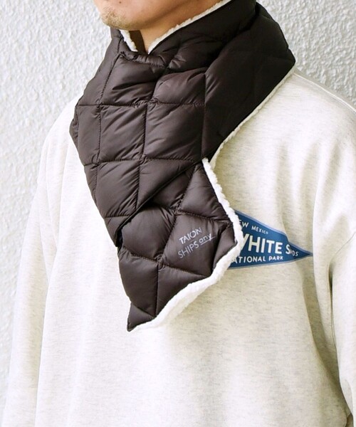 TAIONへ別注!コスパ抜群のリバーシブルで使えるダウンマフラー 【素材特性】 軽量で柔らかくハリのある高密度ナイロンタフタ素材を表側に使用。 裏側には、ボアフリース素材を使用し保温性も抜群です。 手洗いによるメンテナンスが可能。 【デザイン】 TAIONに別注したリバーシブルで使用可能なマフラー。 表のナイロンタフタ面はキルトステッチで、ビジネス対応も考慮したシャープな印象に。さりげなくTAIONとのダブルネームを施しており、特別感溢れる一品です。 裏のボアフリース面はカジュアルなスタイルにピッタリで、肌触りのよいボアで温かみがあります。 リバーシブル仕様で、コーディネートによって変化をつけられ、ユニセックスでも使用できます。 コスパ抜群なダウンマフラーですのでプレゼントとしても◎ ---------------------------- 裏地:無 光沢感:有 生地の厚み:やや厚め 伸縮性:無 透け感:無 水洗い:手洗い ---------------------------- 【注意事項】 ※末永く愛用頂く為に、アテンションタグ・洗濯ネームを必ずご確認の上、着用又はお取り扱いください。 ※撮影環境による光の当たり具合やパソコン・スマートフォンなどの閲覧環境によって、実際の色味と異なって見える場合があります。 商品の色味は商品単体で撮影した画像をご参照ください。 ※画像の商品はサンプルです。 実際の商品と仕様、加工、サイズが若干異なる場合がございます。