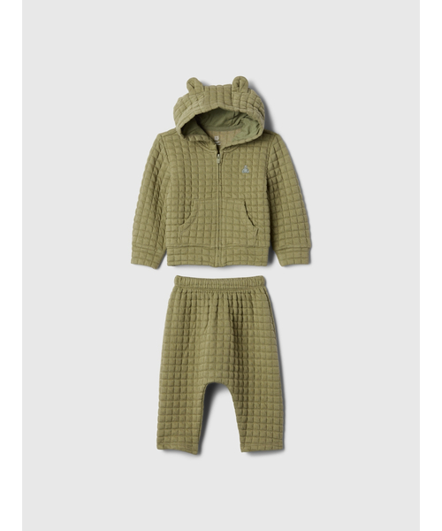 優しく心地良い肌触りのキルト加工ニットパーカーとプルオンパンツのセット くま耳付きフード 長袖 フロントファスナー フロントカンガルーポケット ウエストゴム仕様のパンツ カラーバリエーションありとても柔らかくて軽い薄手のセットアップ、普段使いからお出かけにもおすすめです。秋口の羽織物としても最適。 キルティングで余分な縫い目がなく、シンプルすぎず、すっきりとしたデザイン お尻まわりにゆとりがあり穿かせやすいパンツ ポリエステル混紡で軽くて乾きが早く、型崩れを軽減します。羽織物なので、肌に直接触れにいです。 キルティング素材なので、しわが目立ちにくく、軽いので持ち運びにも便利です。 *商品タグに記載の価格とサイト上の販売価格が異なる事があります。 【Gap ギャップ】1969年にアメリカ・サンフランシスコで創業以来、世界的なカジュアルファッションブランドとして、常にモダンなアメリカンカジュアルを提案し続けています。