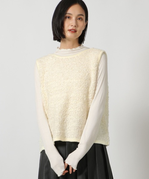 前後でネックのデザインが異なるベストは2WAYで着用いただける1点。表面感のある素材でスタイリングのアクセントにも〇コンパクトなシルエットなのでスタイリングにも取り入れやすいアイテムです。【素材】さりげないラメ混糸を使用した表面感のある素材感。【スタイリング】シンプルなスタイリングとの相性〇