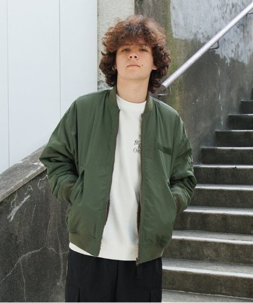 本格的なMA-1デザインと、冬らしい見た目のボア、両方で着られるリバーシブル仕様。 ゆったりとしたサイジングで、インナーに厚手の裏毛を着ても着心地抜群。 表はハリのあるナイロン素材を使用。フラップ付きのポケットで物が落ちる心配もありません。 内側は毛足の長いボアを使用しているので、保温性があり初秋から冬まで長く着用可能です。 【モデル】 身長175cm 着用サイズ:L(170cm) ※モデル着用の商品は、こちらのページの商品以外は参考イメージとなっております。 【ご注意点】 ■ボア生地の特性上、多少毛羽が抜けることがあります。無理に引っ張ったりしないようご注意ください。 ■他の衣類に付着した毛羽は、ブラッシング等でお取りください。 ■着用の際は、できるだけ同色系の衣類との組み合わせをおすすめいたします。 【透け感】なし【伸縮性】なし【裏地】あり【ポケット】あり※表フロントポケット×2、裏フロントポケット×2、袖ポケット×1
