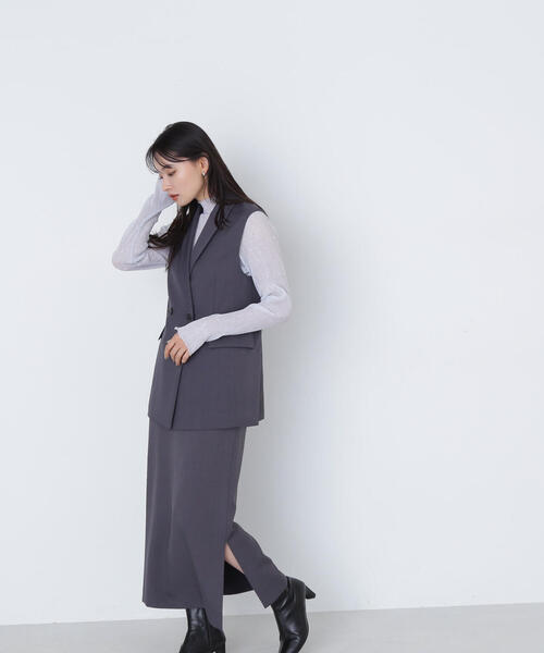 <お仕事シーン・オフィスカジュアルにおすすめ>サイドにスリットをあしらった抜け感のあるナロースカート。ウエストまわりがすっきり見えるように続きのウエストデザインにし、後ろはゴム仕様のためストレスフリーなはき心地です。デザイン性のあるポケット付きで利便性もプラス。同素材のジレとセットアップでも着用いただけます。<素材>肉感のあるクリアなツイル素材を使用しています。<詳細>仕様・左ファスナー裏地・あり透け感・なし / 光沢・なし / 伸縮性・なし 生地の厚さ・普通<シリーズ>■ジレ[品番:017-4255816] ■パンツ[品番:017-4230816] ※モデルの着用画像の場合、光の当たり具合により、実際の色味と異なって見えることがございます。色味は、商品単体の画像をご参照ください。※ウエスト切り替え位置下から裾までのスカート丈は86.5cmになります