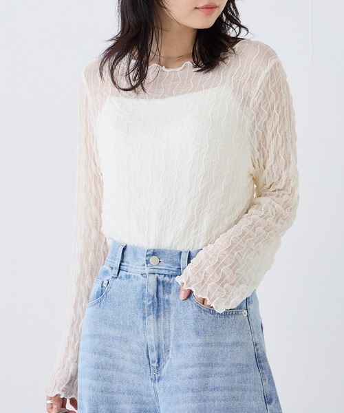 透けすぎないシアー感が魅力のウェーブトップス■デザイン袖口と裾はメローフリルで軽やかな印象に。表情豊かなウェーブ柄が、大人のこなれ感を演出してくれます。やや長めの袖丈と身体にフィットしすぎない程よいゆとりが魅力です。■素材上品な透け感のある、ストレッチの効いた柔らかな生地感。■コーディネートワイドパンツなどボリュームのあるボトムと相性◎キャミワンピやジャンスカのレイヤードインナーとしてもおすすめです。カジュアルからキレイめまで幅広く合わせやすく、季節の変わり目にも活躍するアイテムです。・お手入れ方法:洗濯機可・大きいサイズ対応/マルチサイズ展開 (M/L/LL/3L/4L)※生地の特性上、記載サイズと誤差が生じる場合がございますが、ストレッチの大きい生地なので着用には問題ございません。--------------------------------------透け感:あり裏地:なし伸縮性:あり生地の厚さ:薄手---------------------------------------【お買いものをよりお楽しみいただく為に♪】▼商品のお気に入り登録(ハートマークをクリック)お気に入りアイテムの完売カラーの再入荷通知や、ラスト1点の通知、セールの通知も受け取ることができます。▼ブランドのお気に入り登録新商品や再入荷など、クーポン配布などのお得な情報を受け取ることができます。■商品注意事項■※商品画像は、光の当たり具合やパソコンなどの閲覧環境により、実際の色味と異なって見える場合がございます。予めご了承ください。※末永く愛用頂く為に、アテンションタグ・洗濯ネームを必ずご確認の上、着用又はお取り扱い下さい。※生産時期により色味が多少異なる場合がございます。