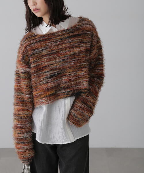 グリーンカラーご全国でご好評につき追加生産決定!<12月下旬-1月中旬お届け予定> 131-5170023で検索! 〔fabric&design〕段染めでグラデーションボーダー柄になったニットソートップス。 シャギーヤーンを編み込んでいるので表情感があります。 ボックス型で身幅は広めですが短丈なのでバランスが取りやすいです、 長めの袖丈にしているのでくしゅくしゅとさせてかわいいシルエットに。 〔stylinig〕 トレンドのシャギー素材でぼだー柄なのでデニムを合わせるだけでスタイリングが完成します。 合皮ミニスカパン(131-4220010)合わせで辛目に仕上げても◎ ■透け感:ややあり ■生地の厚さ:普通 ■裏地:なし ■伸縮性:ややあり ■光沢:なし ■シルエット:スタンダード ------------------------------------------------------ ◆商品のお気に入り登録◆ お気に入りアイテムの値下げ・再入荷・在庫1点などの通知を受け取ることができます。 ◆ブランドのお気に入り登録◆ 新商品や再入荷、セール、クーポン配布などお得な情報を受け取ることができます。 ------------------------------------------------------ ※ご注文いただいた予約商品のお届け時期の確認は、注文履歴ページより行えます。