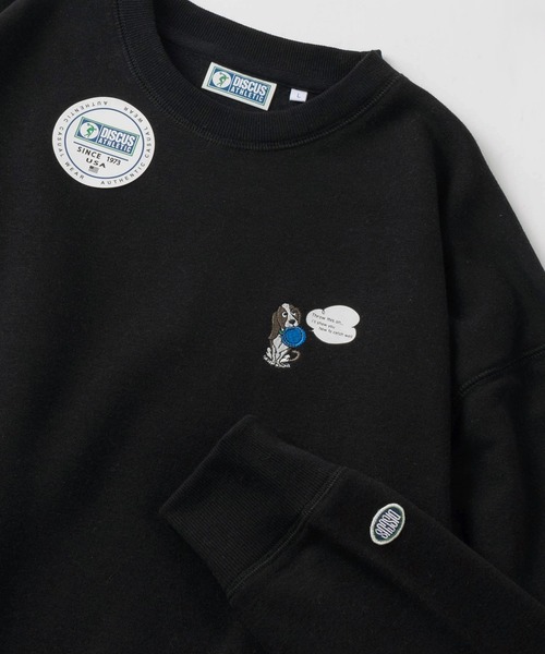 【DISCUS/ディスカス】FLYING DISC DOG キャラクターイラスト ワンポイント刺繍&ピスネームタグデザイン クルーネックスウェット/裏起毛