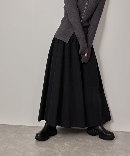 【デザイン・シルエット】 程良い張り感のあるナイロン素材のティアードスカート。 切替え位置を調整することで腰回りをすっきりとしたシルエットに仕上げました。ウエストの後ろがゴム仕様になっている為、ストレスフリーに着用頂けます。 【コーディネート】 シンプルなデザインでアイテム問わず、合わせやすい1枚。 プリントTシャツとカジュアルに合わせるのはもちろん、リブニットと合わせたフェミニンなスタイルもおすすめです。 【素材】 ワッシャー加工の入ったナイロン素材による張り感で、程良いボリューム感を演出してくれます。 ----------------------------- 裏地:なし 光沢感:なし 透け感:なし 伸縮性:なし 生地の厚さ:ふつう ----------------------------- 【着用サイズ】 モデル H164 B81 W61 H90 着用サイズ FREE ロングスカート/フレアスカート/ティアードスカート/通年/デイリー/秋カラー/カジュアル ※実際の商品はお客様のお使いの端末や閲覧環境により、写真と実物の色味や質感が多少異なって見える場合がございます。予めご了承ください。