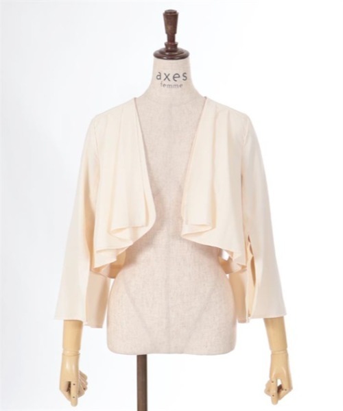 ********************** お呼ばれにぴったり♪Dress collection ********************** 【Point】 ケープ風のふんわりシルエットが上品なオケージョンボレロです。 トレンド感のあるスリット袖は七分丈になっておりシーズンレスで着用ができます。 短めのショート丈でワンピースやオケージョンドレスとバランス良く合わせることができます。 【Styling】 ベーシックな生成り・黒の2色展開で幅広く合わせられます。 【Wearing scene】 結婚式,披露宴,冠婚葬祭,二次会(2次会),パーティー,セレモニー,アフタヌーンティー,レストラン,お呼ばれ,成人式,同窓会,食事会,謝恩会,忘年会,新年会,女子会,演奏会,発表会,記念日,デート,入学式,入園式,卒業式,卒園式,参観日,学校行事,お宮参り,七五三などのオケージョンシーンでご利用いただけます。 #20代 #30代 #フォーマル ▽ axes femme * アクシーズファム 【Concept】 axes femmeのお洋服であなたのライフスタイルに ほんの少しだけ彩る花が咲きますように。 ブランドを通して、彩る花たちが、 人と人、お客様や作り手たちの想いが世界中に繋がっていきますように。 ベル・エポック(フランスの古き良き時代)にパリジェンヌたちが愛したファッションや文化にルーツをおき、 独自のフェミニンスタイルを楽しむブランド ********************** .。.:? お気に入り登録のおすすめ ?:.。. ∇気になるアイテムを登録∇ ハートをクリックしてお気に入りに登録すると 完売カラーの再入荷やラスト1点の通知、セールの通知を受けとることができます。 ∇ブランドを登録∇ 新商品や再入荷、セール通知など、いち早くブランドの情報を受けとることができます。 是非ご利用頂き、お買い物をお楽しみ下さい。 .。.:? 商品について ?:.。. ・サイト上のカラー名と、お届け商品に記載されているカラー名が異なる場合がございます。 ・商品の色味は、撮影場所や光のあたり具合、お客様のお使いのPCのモニター環境などにより色味が違って見える場合がございます。 予めご了承の上ご注文下さい。 .。.:? 返品・キャンセルについて ?:.。. ・着用、洗濯後の返品は致かねます。 ・商品到着後、着用前に商品を確認して頂きますようお願い致します。