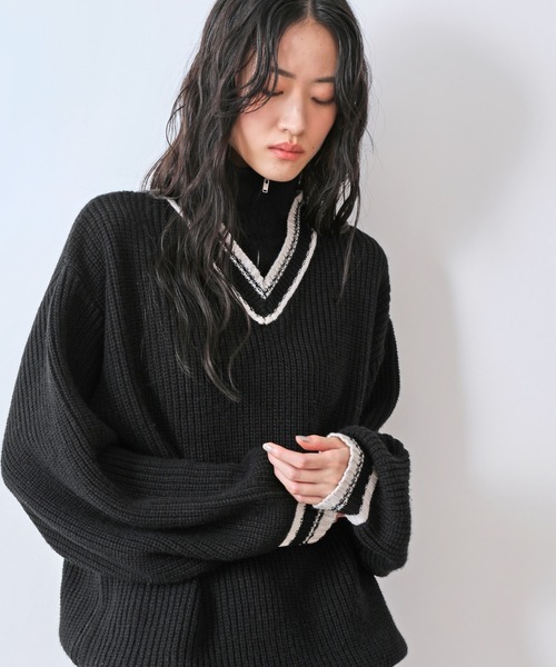 【素材】程よい膨らみと弾力のある、アクリル素材を使用。【デザイン・シルエット】レトロな雰囲気が漂う、旬な古着風スタイリングを作る一枚。チルデンニットのようなVネックニットの中に、ハーフZIPニットをレイヤードしたようなデザイン。ジップを開けた時にも、全て閉めた時にもきまる、襟の高さと幅にこだわりました。リラックスして着用いただける、ルーズサイズです。裏地:なし透け感:なし伸縮性:あり生地感・厚さ:普通ポケット:なしその他仕様:なし【モデル着用サイズ】MEN:身長174cm 着用サイズL※撮影場所やライティング、お使いのモニター環境によって色の見え方が異なる場合がございます。※商品のカラーは詳細画像の色味をご参照ください。