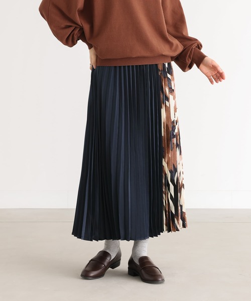 ■デザインサイドを柄で切り替えたアコーディオンプリーツスカート。ボタニカルを思わせるアート柄が目を惹く一枚です。ウエストは総ゴム仕様でストレスフリーな穿き心地。■素材無地部分には上品な光沢感があるピーチサテン生地を使用。印象的なボタニカル調の柄生地を切り替えました。滑らかな肌触りの裏地付きです。■コーディネート一枚で存在感のあるスカートなので、無地のシンプルなアイテムと合わせるだけでお洒落な着こなしが完成します。柄に使用されているカラーと同系色のアイテムで合わせると、統一感のある着こなしに。