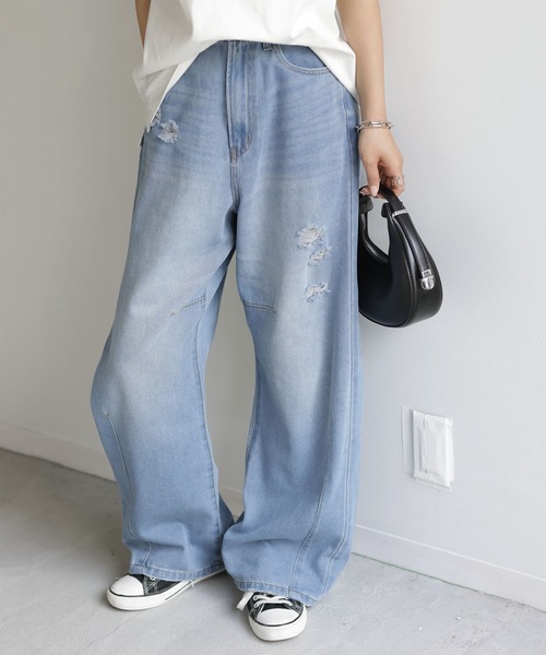 【商品説明】 存在感抜群のカーブラインがこなれ感ある印象のデニムパンツです。 ダメージ加工が特徴で記ですがヒップラインや脚のラインなど気になる部分をさりげなくカバー。 シンプルなアイテムとスタイリングするだけでも抜群にサマ見えする主役級パンツです。 サイズ:S 総丈:103.5cm ウエスト:65-73cm ヒップ:100cm 股上:35cm 股下:70cm わたり幅:33cm 裾幅:25cm サイズ:M 総丈:104cm ウエスト:68-76cm ヒップ:103cm 股上:35.5cm 股下:70cm わたり幅:34cm 裾幅:25cm サイズ:L 総丈:104.5cm ウエスト:71-79cm ヒップ:106cm 股上:36cm 股下:71cm わたり幅:35cm 裾幅:26cm サイズ:LL 総丈:105cm ウエスト:74-82cm ヒップ:109cm 股上:36.5cm 股下:71cm わたり幅:36cm 裾幅:26cm 【スペック】 裏地:なし 透け感:ダメージ部分あり 伸縮性:ややあり ポケット:あり 重さ(S/M/L/LL):約482g / 約499g / 約517g / 約534g 【素材】 綿60% レーヨン27% ポリエステル13% ※ご覧のモニター環境により、商品画像と実物の色味が多少異なって見える場合がございます。 ★『お気に入り登録』で最新情報をGET★ ▼商品のお気に入り登録 セール・再入荷・在庫ラスト1点などの通知を受け取ることができます! ▼ブランドのお気に入り登録 新商品や再入荷などお得な情報を受け取ることができます! ◆ HUG.U / ハグユー ◆ 体型やライフスタイルに縛られず 「そのままの貴方」が輝く洋服。 Instagram:@hug.u__official 着用感など随時更新しております。 是非チェックしてみてください。 ※他のキャンペーンにより、期間中に価格が変動する場合があります。 ※セールは予告なく終了させていただく場合もあります。