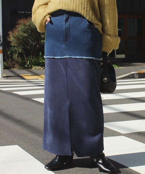 ■デザイン上はデニム、下はカットスウェードを組み合わせたカジュアルにもきれいめにも使いやすいデザイン。温かみのあるカットスウェードで、シーズンライクな着こなしに。ストレスフリーな後ろウエストゴム仕様と歩きやすいフロントスリットもポイントです。■素材上:やや伸縮性のあるデニム生地下:柔らかい肌ざわりのカットスウェード■コーディネートカジュアルなロンTを合わせてラフに着崩したり、タイトなリブニットを合わせて女性らしいスタイルにも重宝します。ブラックとネイビーの合わせやすいカラー展開なので、柄トップスやカラーアイテムとも相性抜群です。・Iラインシルエット・配色/バイカラー・お手入れ方法:洗濯機可・マルチサイズ展開/大きいサイズ対応(M/L/LL/3L/4L)--------------------------------------透け感:なし裏地:なし伸縮性:あり生地の厚さ:やや厚手---------------------------------------【お買いものをよりお楽しみいただく為に♪】▼商品のお気に入り登録(ハートマークをクリック)お気に入りアイテムの完売カラーの再入荷通知や、ラスト1点の通知、セールの通知も受け取ることができます。▼ブランドのお気に入り登録新商品や再入荷など、クーポン配布などのお得な情報を受け取ることができます。■商品注意事項■※商品画像は、光の当たり具合やパソコンなどの閲覧環境により、実際の色味と異なって見える場合がございます。予めご了承ください。※末永く愛用頂く為に、アテンションタグ・洗濯ネームを必ずご確認の上、着用又はお取り扱い下さい。※生産時期により色味が多少異なる場合がございます。予めご了承ください。
