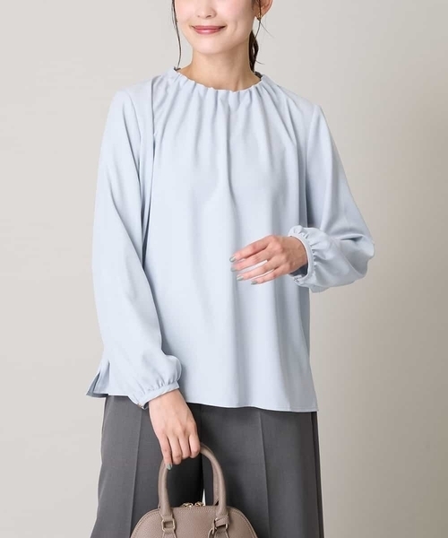 ◆首元のタックデザインが華やかなブラウス◆ 【デザイン】 ・定番のタックブラウス ・首にほどよく沿うタックデザインが華やか&上品な印象 ・首回りがゴムが入っているので 着脱がスポっと被るだけで簡単なのが嬉しいポイント◎ ・ジャケットを羽織ると襟元が映えるデザインなので1枚有ると重宝するブラウスです ・ベーシックなホワイトとさわやかなライトブルーの2色展開 【素材】 ・動きやすいハイストレッチ素材 ・ご家庭の洗濯機で洗えます 【コーディネート】 一枚はもちろん、お仕事シーンでの ジャケットやカーディガンのインナーにおすすめ。 インもアウトも決まる丈感なので、ボトムを選びません。 日常の通勤スタイルから、 七五三や学校行事、発表会などお子様のハレの日にも◎ フォーマルな場やビジネスシーンに活躍してくれる ベーシックなブラウスは一枚あると重宝します。 -------------------- 透け感:白のみややあり 裏地:なし 伸縮性:あり 光沢感:なし 生地の厚さ:ふつう -------------------- ≪お気に入り登録機能の使い方≫ ■商品のお気に入り登録(ハートマークをクリック) 再入荷通知や値下げ等、お得なご案内を受けることができます。 -------------------- ※商品画像は、光の当たり具合やパソコンなどの閲覧環境により 実際の色味と異なって見える場合がございます。 商品の色味の目安は商品単体の画像をご参照ください。 ※34(XSサイズ)・42(XLサイズ)はWEB・一部限定店舗での販売です。