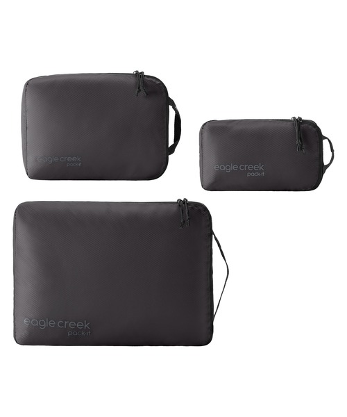 EagleCreek イーグルクリーク パックイット アイソレート キューブセット は旅行やジムのバッグの中を整理整頓しておくのに便利な、3サイズがセットになったパッキングキューブのセットです。XS、S、Mサイズのセットで、用途に合わせて使い分けができるので荷物の収納がとても便利になります。旅行やキャンプ、アウトドアシーンなどのさまざまなパッキングに便利で、生地はとても軽く半透明でうっすらと中身が見えるため収納したものを探しやすいです。斜めになったジッパーのデザインにより衣類を折りたたんだり丸めて入れても収納しやすく、パッキングスペースを最大限に活用できます。環境にも配慮された100%海洋リサイクル素材を使用し、水に強く軽量です。●特徴・衣類を折りたたんでも、丸めて入れても収納しやすい斜めの開口部・EagleCreekで最も軽量なパッキングキューブ素材を使用・半透明の生地で中身が確認しやすい・持ち運びに便利なトップハンドル・つかみやすいジッパープル■SPEC■XSサイズ・サイズ:19cm×11cm×6cm・容量:1L・重量:17gSサイズ・サイズ:25cm×18cm×8cm・容量:3L・重量:28gMサイズ・サイズ:36cm×25cm×8cm・容量:7L・重量:77g【EagleCreek / イーグルクリーク】世界のすべての旅人のために、米国、カリフォルニア州サンジャント山脈の街でスティーブ・ベーカーと妻のノナが、クライミングのメッカである南カリフォルニアのアイレルワイルドに、マウンテニアリングショップ「Mountain People」を開店したのは1972年のことでした。彼らはそこで登山用具を販売し、またクライミングを教え、さらに顧客からの注文で登山用パックを作り「Mountain People」のブランド名で販売していました。これがEagleCreek ( イーグルクリーク )社の前身です。1975年「Mountain People」を閉店したスティーブとノナはパック製造に専念することにしました。会社は「EagleCreek」と名付けられ、カリフォルニア州サンディエゴのソラノビーチの広さ約140平方メートルの倉庫で生産が開始されました。