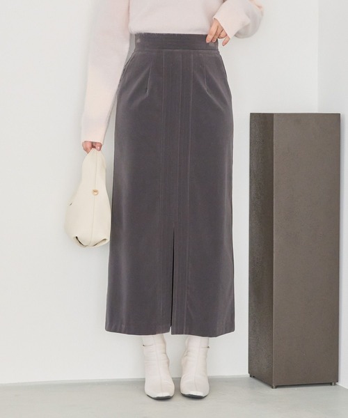 起毛した別珍素材が、秋冬ムードたっぷりなスカート。 今シーズン注目の別珍素材ならではの、温もりと良質感がポイント! 保温性にも優れており、真冬のスカートスタイルにも重宝します。 フロントスリットでブーツ着用時も快適な足さばきが叶います。 フロントとベルトのステッチが程よいデザインアクセントに。 コンパクトニットや華やかなブラウス、ふんわりとした毛足ニットなど、さまざまなトップスと合わせられ、スタイルに加えるだけで深みが増す、秋冬らしい一着です。 ※ウエスト最大S:74 M:77 ※屋内外の光や照明の当たり具合で、実際の商品の色味とカラー別画像の色味に違いが発生する場合がございます。色味はスタジオ撮影の詳細画像にてご確認ください。 ※生地の寄り画像が最も実物に近い色味となります。 ーーーーーーーーーーーーーーーーーーーーーーー ▼ 商品のお気に入り登録 ▼ 完売カラーの再入荷通知や、ラスト1点の通知、 クーポン開始、セールの通知も受け取ることができます。 ▼ ブランドのお気に入り登録 ▼ 新商品や再入荷など、 ブランドのお得な情報をいち早くお知らせ! ぜひご登録ください!