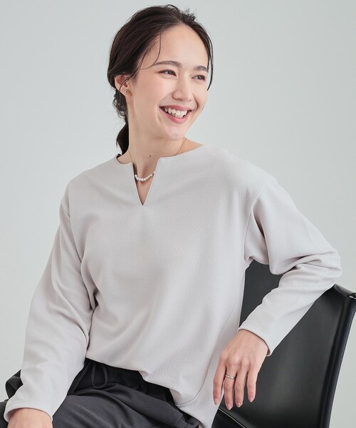 【デザイン】表面の細かいしぼ感が上品に見え、裏がさらさらとしたキーネックのトップスです。深すぎないキーネックラインが顔周りをすっきりと見せてくれます。程よくゆとりのあるサイズ感でさりげなく体型カバーもしてくれます。ストレッチ性があるので、しわになりにくい素材でオフィスカジュアルにもおすすめです。【スタイリング】キレイめのパンツと合わせて大人シンプルなスタイリングがおすすめです。ナロースカートなどと合わせて大人のこなれフェミニンなスタイリングも好相性です。【素材】裏がさらさらしたシボ感のある素材を使用しています。※照明の関係により、実際よりも色味が違って見える場合があります。また、パソコン・スマートフォンなどの環境により、若干製品と画像のカラーが異なる場合もございます。モデル情報:身長163cm B81 W59 H88 着用サイズ:02(M)店舗へのお問い合わせ商品番号:C62-19054●製品寸法:01(S):着丈61cm B98cm 袖丈49cm 肩幅44cm02(M):着丈62cm B102cm 袖丈50cm 肩幅45cm03(L):着丈64cm B106cm 袖丈51cm 肩幅46cm04(LL):着丈66cm B110cm 袖丈52cm 肩幅47cm備考: