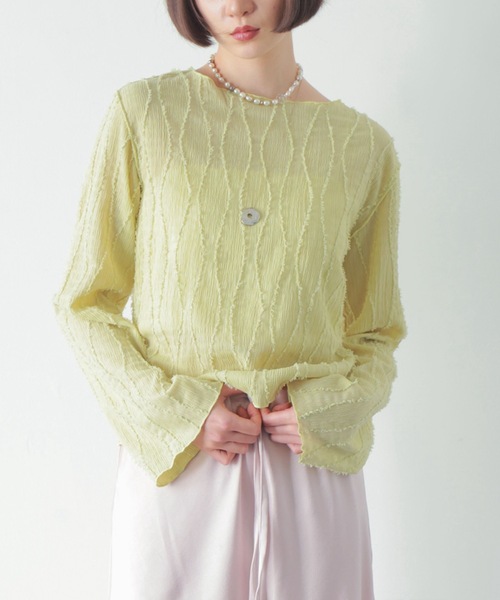〜トップスとしてもインナーとしても大活躍!シャギーカットソー素材のデザイントップス!〜【商品ポイント】 ・程よい透け感でこなれ感が出ます ・生地は伸縮性のあるカットソー素材のため、着心地抜群 ・袖や首元のメローデザインで、女性らしさを演出 ・デザインのある生地を使用しているので1枚で着てもオシャレ **************** 裏地⇨なし 透け感⇨ややあり 伸縮性⇨あり 光沢感⇨なし 生地の厚さ⇨普通 **************** サイズ F カラー アイボリー/ライトグリーン 【SNS掲載情報】 @purebright_jp 公式Instagramアカウントにて新作情報をはじめ様々なコンテンツを掲載しております。 ぜひご覧ください! 【商品のお気に入り登録】 完売カラーの再入荷通知やラスト 1点の通知プライスダウンの通知も受け取ることができます。 ぜひご登録ください! 【ブランドのお気に入り登録】 新商品や再入荷などブランドの情報をいち早くお知らせしますぜひご登録ください! ※ご注意屋外の光や照明のあたり具合で、実際の商品の色味とカラー別画像の色味に若干の違いが発生する場合がございます。
