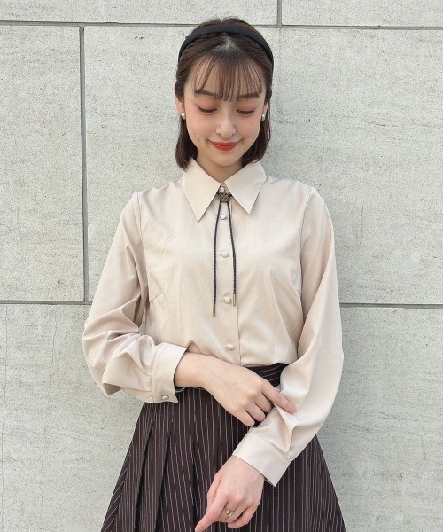 ■デザインポイント エンブレムモチーフのループタイがプレッピーなシャツ。 ちょっぴりトレンドライクなタイ使いがいつもと違う新鮮なコーデにアップデートしてくれます。 衿先は程よく垂れたデザインでレトロな仕上がりに♡ さらっとしたシャツ素材なので幅広いシーンでお使いいただけます。 ■オススメスタイリング ワンピースと合わせた新鮮なレイヤードコーデがイチオシ♪ もちろんプリーツスカートやニットベストに合わせ王道プレッピーに着こなすのも◎ ループタイは取り外しができるのでシンプルなシャツとして着こなしたり、タイをアレンジに使ったりと着回しも楽しめる一品です。 ====== 透け感:ややあり 裏地:なし 生地感:ふつう ループタイ:取り外し可能 ====== ※裏返してネットに入れて洗って下さい。 ※アイロンは当て布を使用してください。 ▼商品のお気に入り登録▼気になるアイテムの♡をクリックしてお気に入り登録すると残り1点の通知、完売カラーアイテム再入荷の通知、お得な通知が届きます。 ▼ショップお気に入り登録▼ ショップからの新作商品やお得なイベント情報など、いち早くブランドからの情報を受け取ることができます。 ▼Fint/フィント 50~70年代のクラシカルなヴィンテージデザインに トレンド感をプラスしたレトロ&ガーリースタイルをお届け。 古着屋で一点ものを見つけるような【ときめき】を感じられるブランドです。 70s~90sストリートからイメージしたアイテムにレトロ&ガーリー要素をMIXした トレンド感あるカジュアルアイテムが揃う「Pink Label」のアイテムも展開中!