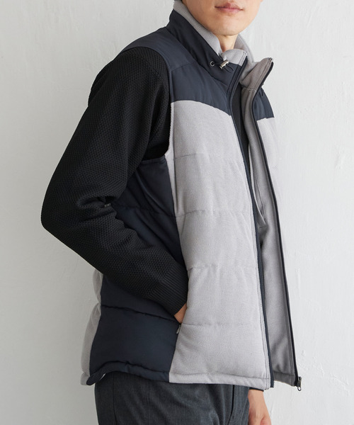 スタイリッシュな切り替えの中綿ベストは、素材感にも違いを出したこだわりの一着。中綿は環境配慮素材「sorona(R)」の保温綿で、エコなあたたかさを堪能できます。【素材】鹿の子素材との異素材使いが特徴のポリエステル。【デザイン】胸元・背ヨーク・脇で素材を切り替えたデザインが特徴。中綿には、原料に植物由来原料を使用した、環境にやさしく保温性のある「sorona(R)」を使用しています。【ikkaポイント】「切り替え」デザインをアウターに採用した、ikka らしい中綿ベスト。単品の存在感は強いが、インナーは柄でも無地でも合わせやすく着回し力が抜群。今年は新色でネイビーが登場です。[クリーニング]手洗い可、ウェットクリーニング(W)