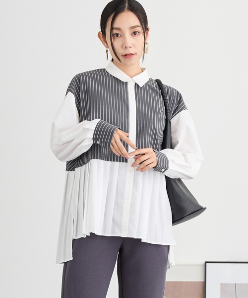 【プリーツシャツブラウス】 【Fabric】 ブロードとストライプ生地 【Design】 プリーツが女性らしい印象になる配色シャツブラウス。 前後差のある丈は、体型カバーと全体のシルエットを綺麗にみせてくれます。 配色カラーなので一枚でコーデの主役になります。 【Styling】 パンツと合わせるだけで旬なコーディネートが完成出来る1枚。 タイトスカートと合わせればキレイめコーデが叶います。 ベストやカーディガンのレイヤードアイテムとしても大活躍間違いなし。裾からちょこっとプリーツ部分をのぞかせてもおしゃれにきまります。 中に薄手のタートルネックを入れても様になる優秀アイテムです。 ------------------------- ■透け感:#91オフ部分若干 ■裏地:なし ■伸縮性:なし ■光沢感:なし ■生地の厚さ:普通 ------------------------- ☆★お買い物をお楽しみいただく為に★☆ ★商品のお気に入り登録 完売カラーの再入荷通知や、ラスト1点の通知、 セールの通知も受け取ることができます。 ★ブランドのお気に入り登録 新商品や再入荷等、ブランドのお得な情報を いち早く受け取ることができます。